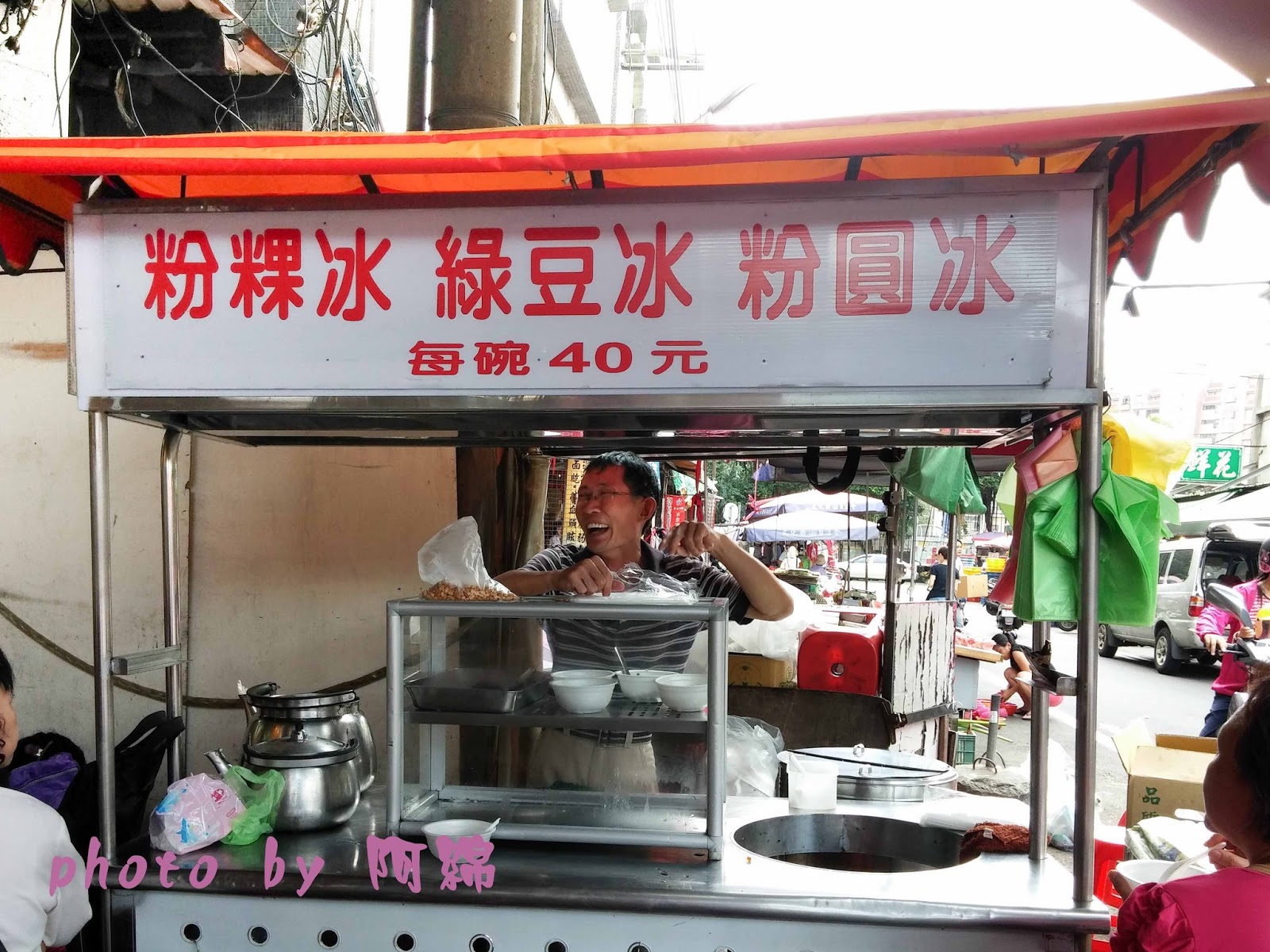 ▼戴眼鏡的斯文老闆正在開心跟人哈啦,抬頭看了看招牌,我問他 : 只有賣粉粿冰、綠豆冰和粉圓冰嗎? 他態度很友善對我說 : 你可以點綜合,綜合的話什麼都有,但是我快收攤了,米苔目已經賣完,不過我其它料會給你多一點 ^.<